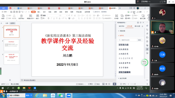 此次培训活动内容丰富,生动有趣,涵盖了关涉汉语教学的各个方面,既包括微观层面上汉语教学中的具体问题,也包括宏观层面上外派汉语教师的形象和责任意识,既有对汉语教学法的深入探讨,又有对教学技能和教学资源的分享介绍。培训过程中,每位教师都倾其所有,为志愿者教师们奉献了精彩内容,与志愿者教师们分享了宝贵经验。刘吉鹏老师着眼于为学习者创设良好的汉语学习环境,以《新实用汉语课本》为例分享了教学课件制作经验;牛士伟老师从实际内容出发,按照课堂教学的顺序对不同语言要素的分类处理进行了详细说明;扎娜老师结合教学中遇到的实际问题,从宏观层面上论述了汉语教学的基本原则;姜心宇老师重点介绍了课堂教学外的教案设计内容,与大家分享了如何准备一堂优秀汉语课的过程;宁怀颖老师以《提升沟通能力,树立教师形象》为题解读了汉语教师的职责,强调了志愿者教师应具备的文化自信、责任意识、沟通能力、团队精神以及树立良好教师形象的重要性等。