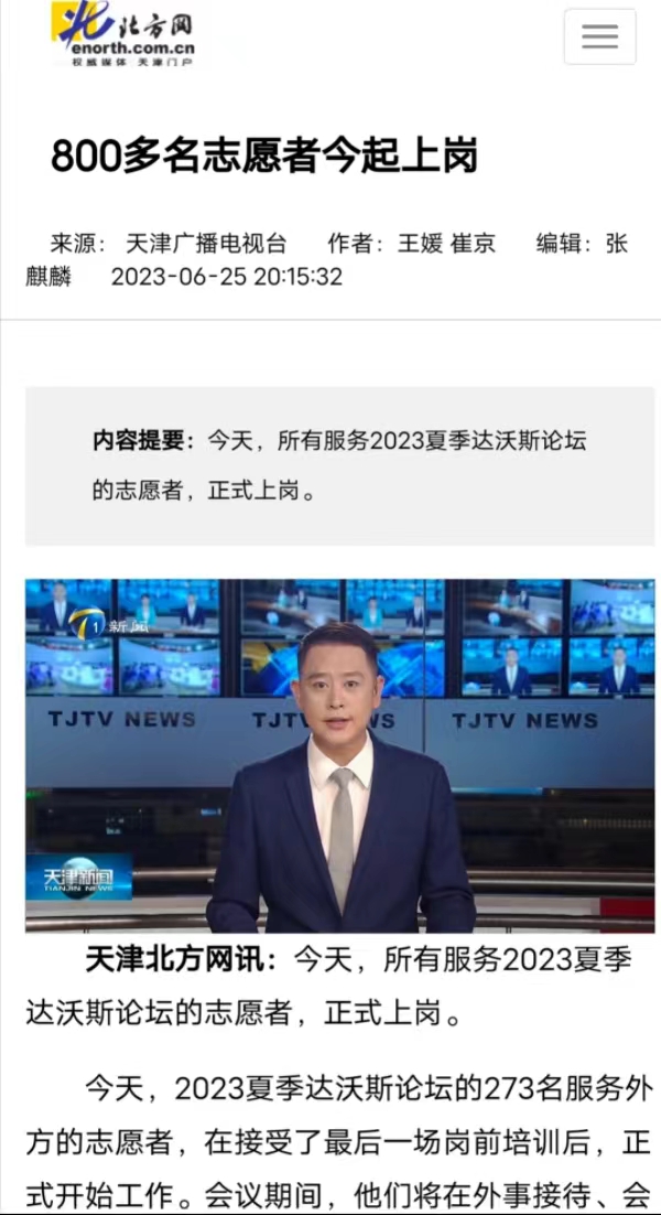 天津北方网讯:今天,所有服务2023夏季达沃斯论坛的志愿者,正式上岗。