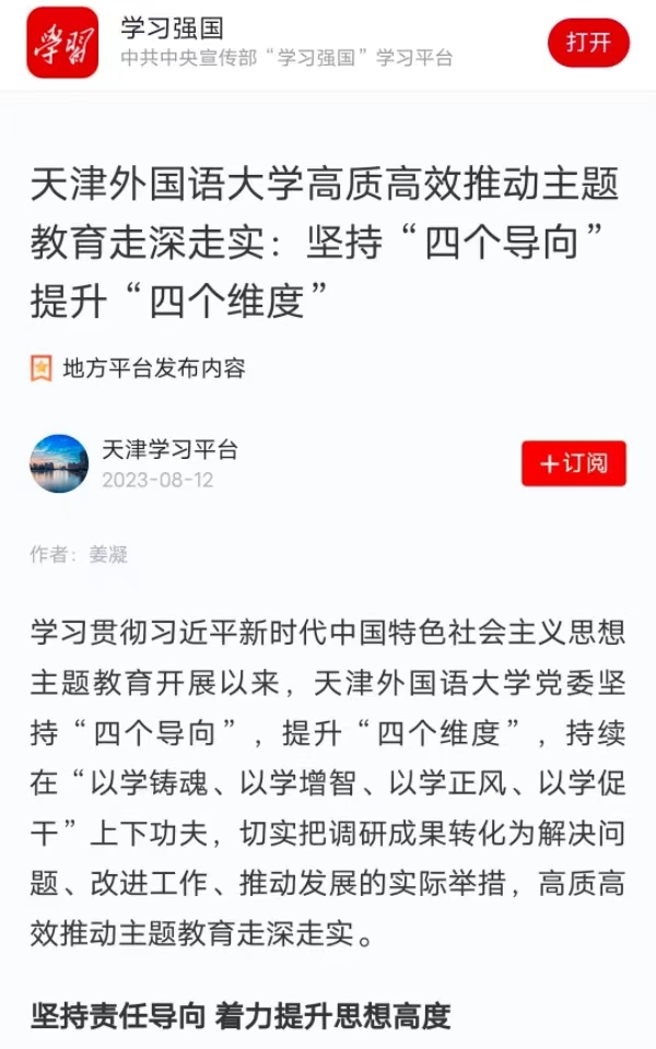 主题教育开展以来,围绕向世界讲好中国故事、传播中国好声音,天津外大充分发挥学科专业特色,依托中央文献翻译研究基地、中国特色社会主义理论体系国际传播外译研究中心等专门机构,组织专业团队完成《中国共产党的一百年》(一、二卷)英文版、《行进天津》系列专题片和《天津概览》等外宣图书翻译任务,在海内外引发热烈反响。