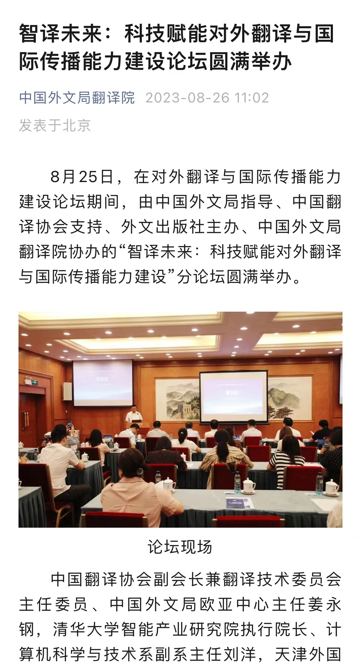 8月25日,在对外翻译与国际传播能力建设论坛期间,由中国外文局指导、中国翻译协会支持、外文出版社主办、中国外文局翻译院协办的“智译未来:科技赋能对外翻译与国际传播能力建设”分论坛圆满举办。