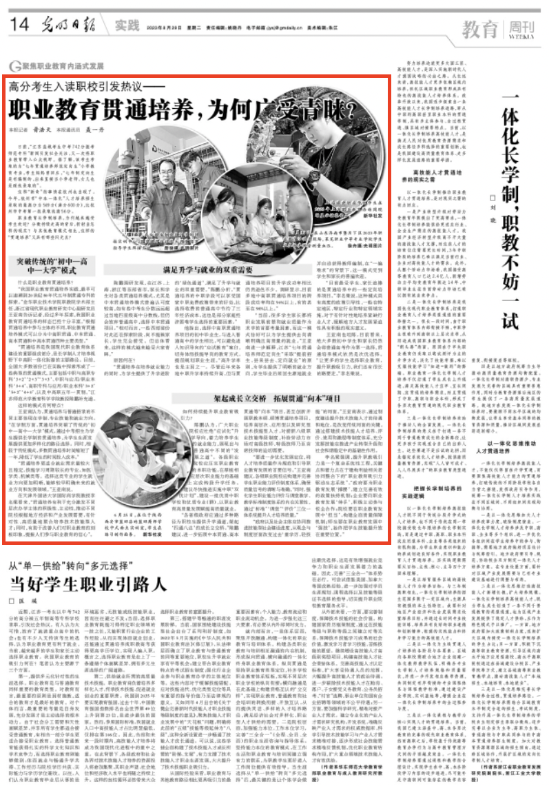 王亚南也坦陈,目前看来,绝大多数初中学生和家长仍然会将普通高考作为第一选择,贯通培养模式依然是次优选择。“让更多的学生选择职业教育,提升职教吸引力,我们还有很长的路要走。”李名梁说。