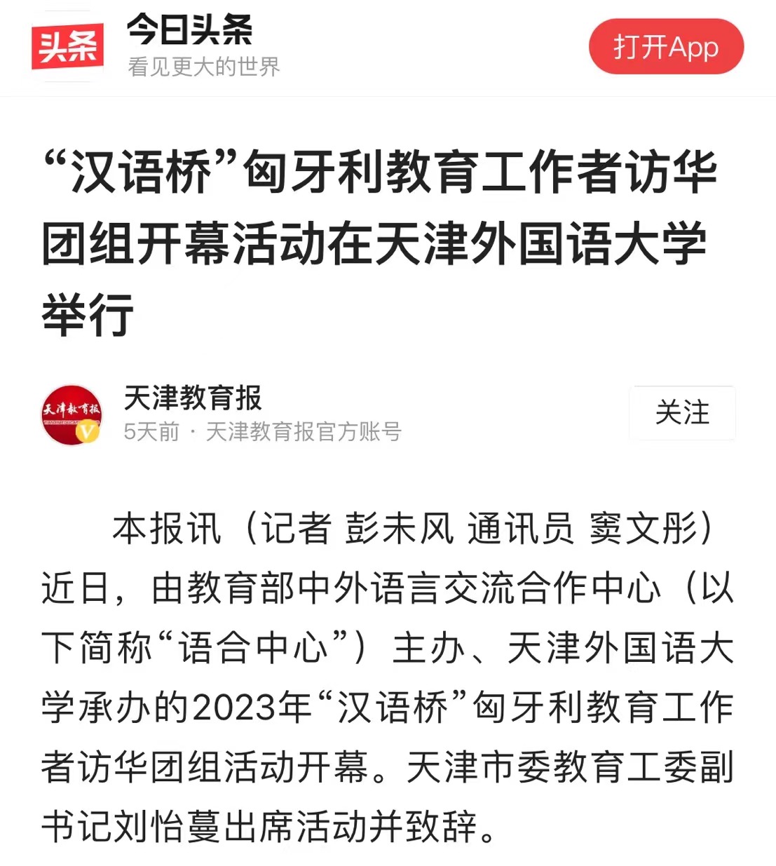 本报讯(记者 彭未风 通讯员 窦文彤)近日,由教育部中外语言交流合作中心(以下简称“语合中心”)主办、星空app官方版官方版下载承办的2023年“汉语桥”匈牙利教育工作者访华团组活动开幕。天津市委教育工委副书记刘怡蔓出席活动并致辞。