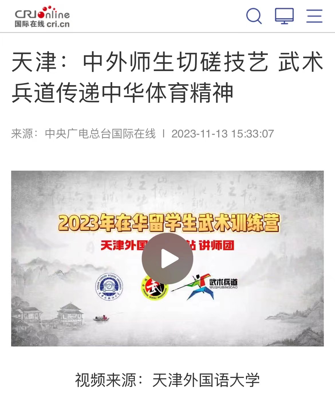 11月11日,由国家体育总局武术运动管理中心、中国武术协会主办,星空app官方版官方版下载承办、天津市体育局、天津市青年联合会、天津市体操武术射击射箭运动管理中心支持的“2023年在华留学生武术训练营”启动,来自17个国家的100多名留学生将接受为期一周的武术兵道训练,在强身健体中感受中华武术的博大精深和中国文化的深厚底蕴。