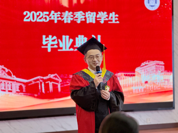 来自德国的苏慕思代表2025年春季全体留学生毕业生发言。他用中文表达了对母校的感激之情,分享了在天外的学习和生活的经历,以及对未来的美好憧憬。