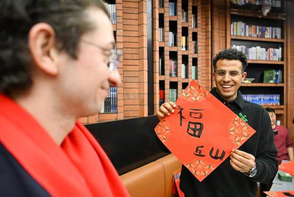 Ahmed mohamed Saleh (2nd R) attends a Spring Festival event at the Zhongshuge Bookstore in Tianjin, north China, Jan. 26, 2025.