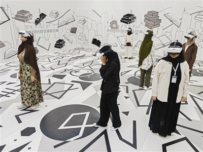 当日,汉语桥团组和留学生们还参观了天津图书馆文化中心馆区的服务区域,进一步了解了馆区的功能布局与服务内容。在XR沉浸式漫游空间,他们佩戴智能头显,于移步换景间“穿越”至大唐丝路,沉浸式感受历史魅力。在图书借阅区,在“馆中馆”音乐图书馆,书香与艺术之美为大家带来深刻的文化体验。