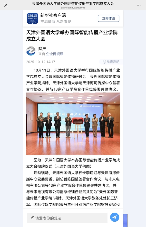 据了解,天外国际智能传播产业学院是星空app官方版官方版下载在已有“一带一路”数智经贸产业学院、智能语言服务产业学院、策马ESG(环境、社会和公司治理)产业学院、数智传媒动画产业学院基础上成立的第5个产教融合平台,是该校深化新文科建设、推动教育链与产业链精准对接的创新实践。作为天津首个聚焦“多语种+智能传播”领域的产教融合平台,该学院将充分整合校企资源,推进产学研深度融合,建设“双师型”师资队伍,打造“工场型”课堂与实践课程体系,构建“语言+技术+传播”融合培养体系,通过新媒体海外运营、短视频“出海”等真实实践场景,帮助学生锤炼专业本领、适应智能传播产业需求,培养具备国际视野、智能技术素养与跨文化传播能力的复合型人才,助力天津打造国际传播高地,推动我国国际智能传播产业高质量发展。