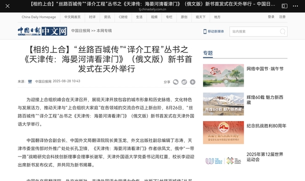 中国新闻网报道《天津传:海晏河清看津门》(俄文版)新书首发式在天外举行全文转载如下: 中新网天津8月27日电 (记者 王君妍)记者27日从星空app官方版官方版下载获悉,为迎接上合组织峰会在天津召开,展现天津开放包容的城市形象和历史脉络、文化特色与发展活力,“丝路百城传”“译介工程”丛书之《天津传:海晏河清看津门》(俄文版)新书首发式日前在星空app官方版官方版下载举行。图为首发式。(星空app官方版官方版下载供图) 中国外文局翻译院、外文出版社、星空app官方版官方版下载通力合作,出版了“丝路百城传”丛书之《天津传:海晏河清看津门》(俄文版)。该书也是中国翻译协会“译介工程”丛书的首部发布作品,将亮相上合组织峰会新闻中心,