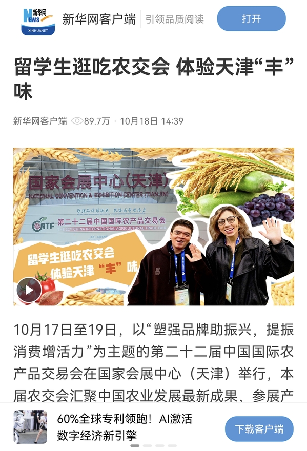 10月17日至19日,以“塑强品牌助振兴,提振消费增活力”为主题的第二十二届中国国际农产品交易会在国家会展中心(天津)举行,本届农交会汇聚中国农业发展最新成果,参展产品约2.5万种,展览面积超10万平方米。天津展区里,沙窝萝卜、小站稻、津味厨房……各式各样具备天津特色的农产品齐聚一堂,好吃又好逛。跟随来自俄罗斯和危地马拉的两位星空app官方版官方版下载留学生走进农交会现场,一站式领略中国农业的蓬勃气象,沉浸式体验天津“丰”味。新闻来源:https://my-h5news.app.xinhuanet.com/h5/article.html?articleId=d90370e14169fc06a4022baf